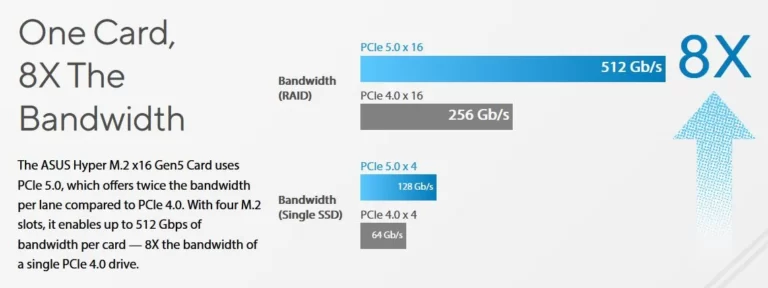 From a efficiency perspective, the adapter capitalizes on the fast knowledge switch charges of 4 PCIe 5.0 M.2 NVMe drives configured in RAID 0 mode, resulting in a consolidated striped array. This configuration allows the cardboard to attain a collective bandwidth of 512 Gbps, translating to roughly 128 Gbps for every slot.