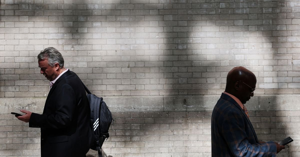 Males stroll taking a look at their smartphones within the Midtown space of New York Metropolis, U.S., October 5, 2023. REUTERS/Shannon Stapleton/File Photograph Purchase Licensing Rights